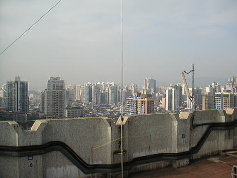 licensing information was known, too. At first I seduced friend's JJ1DWB "Misao". As for him, it is the time when it wanted to do operation from the foreign countries at that time, and it is because I knew that he could prepare the documents of an application for a license rapidly. I received his document, and introduced the plan to operate it from the hotel reserved soon to the tele-communication by E-mail. Then, license application form kind was mailed with EMS soon after it got the answer of OK from the tele-communication. Then, I got the answer of OK from the tele-communication. And, license application form kinds was mailed by EMS soon. The license of Macau is FIXED LOCATION LICENSE. Iit can be operated only in the point which it applied for as an operation point. In other words, it is important to decide a hotel before application for the license. However, "Ham radio can't be permitted." and E-mail were received from that hotel three weeks before going abroad. "What is said now!" Anyway, the necessity to get an antenna setup and the permission of the ham radio from the different hotel arose in me. If it thought now, that was really and only lucky. I could get that permission from HOTEL ROYAL. (Caution: Now, this hotel doesn't permit a ham radio.). But, we don't know the conditions of the roof of that hotel. The license is issued in Macau after the persons in charge of the tele-communication does STATION CHECK. In other words, the license can't get it if an antenna doesn't stand at that time. We checked the roof of the hotel soon, and we had to build an antenna rapidly after we arrived at the hotel. We necessarily had to prepare a little antenna. |